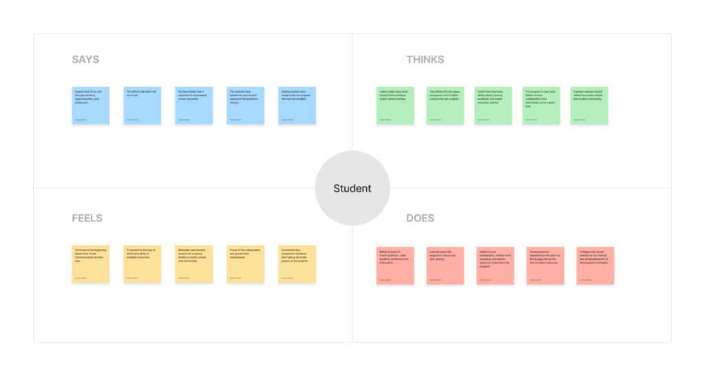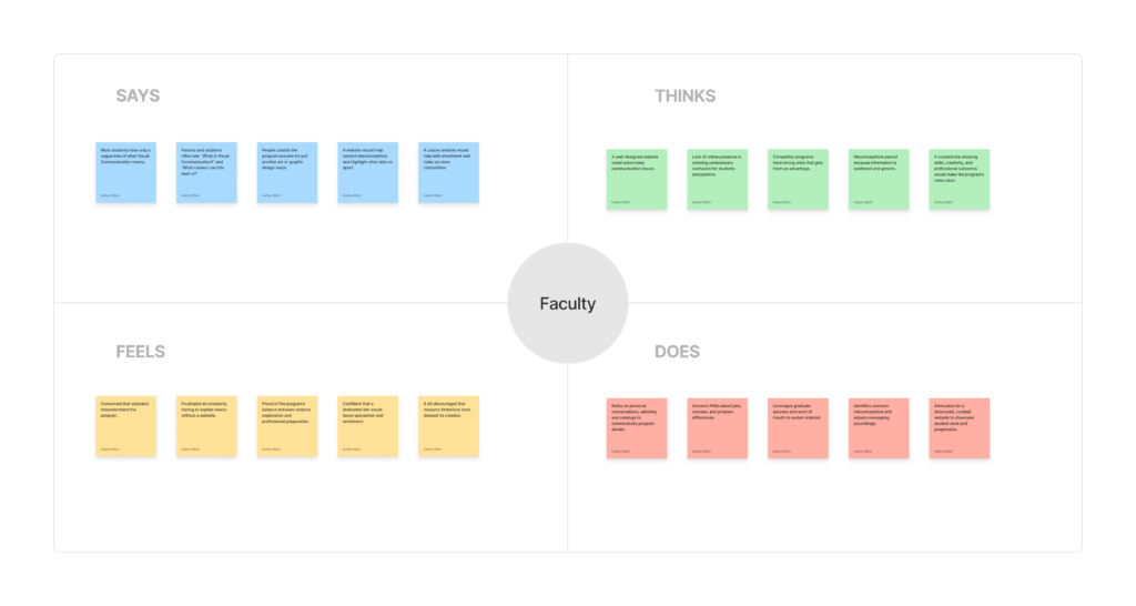 We interviewed three user groups: parents, current students (including seniors), and faculty members. Each group gave us a different point of view. Parents talked about how hard it is to find clear information about the program. Students explained that they relied on word of mouth and advisors because the current online resources didn’t help much. Faculty shared how often they have to repeat basic information because there’s no central website to point people to.