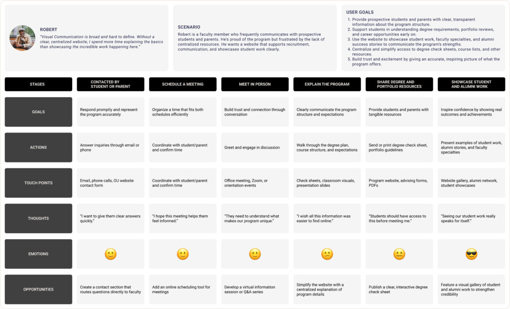 The Define stage was where all the interviews and research started to come together. After talking with students, parents, and faculty, I needed a way to make sense of everything I had learned. Creating personas and user journey maps became my main tools for doing this. By visualizing each user group (a student, a parent, and a faculty member), I could step into their shoes and better understand how they currently interact with the Visual Communication program, what they need, and where their frustrations lie.