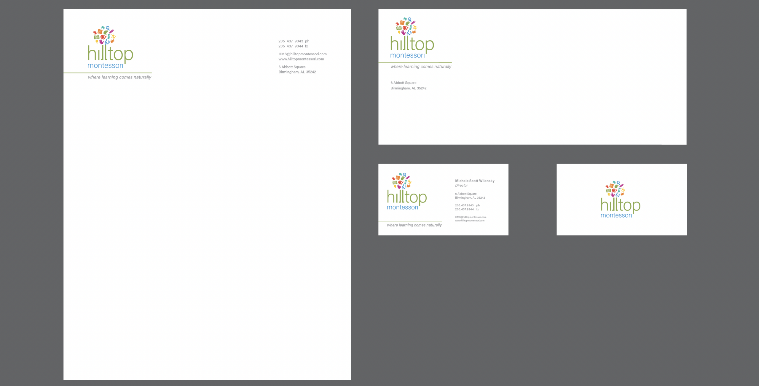 This branding project reimagines the visual identity of Hilltop Montessori School in Mt. Laurel, Alabama. The goal was to create a timeless and flexible identity system that reflects Montessori values while supporting the school across print, digital, and everyday applications.