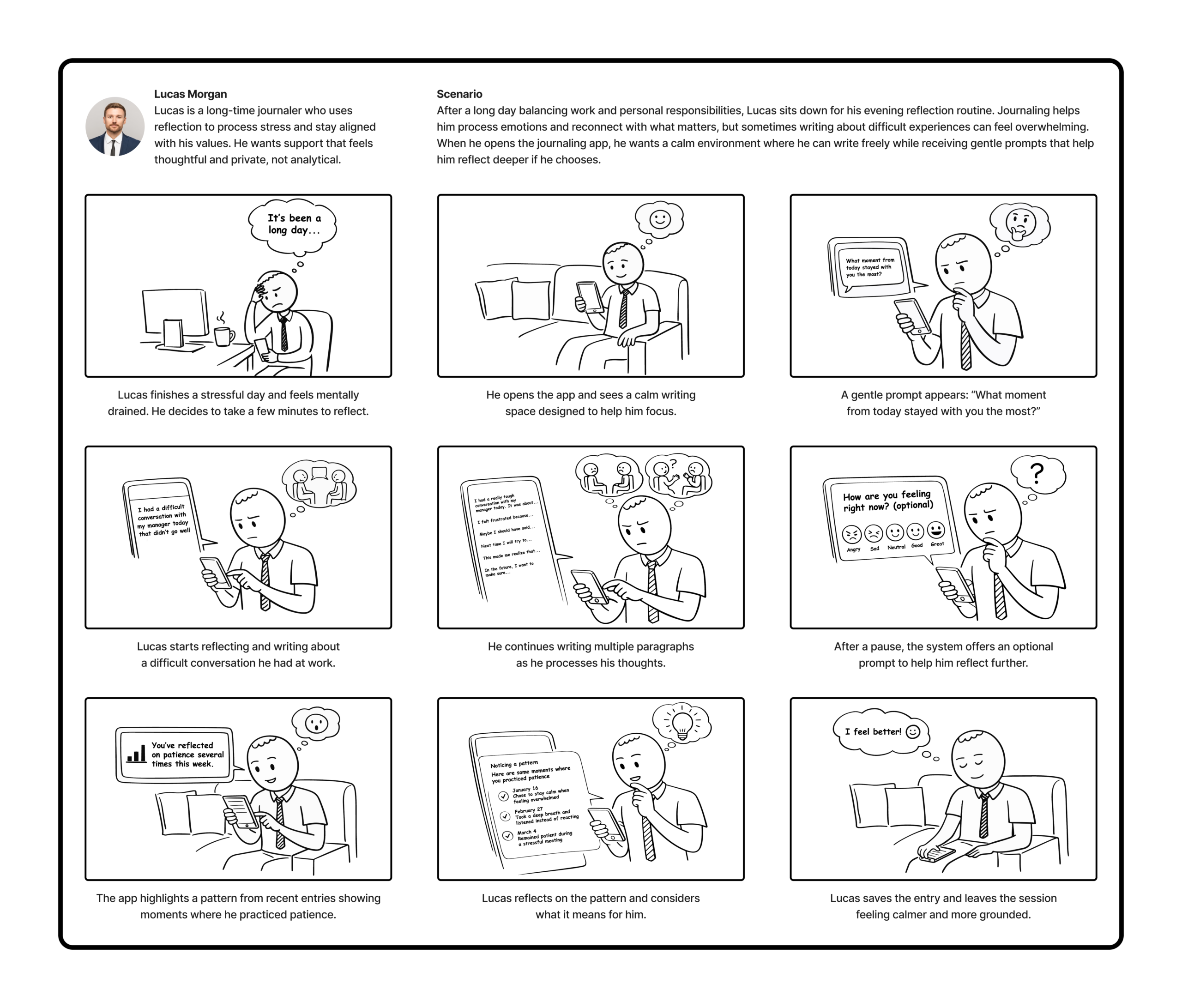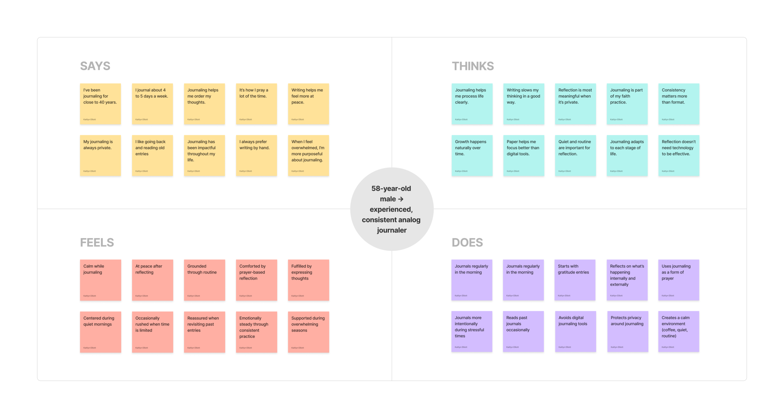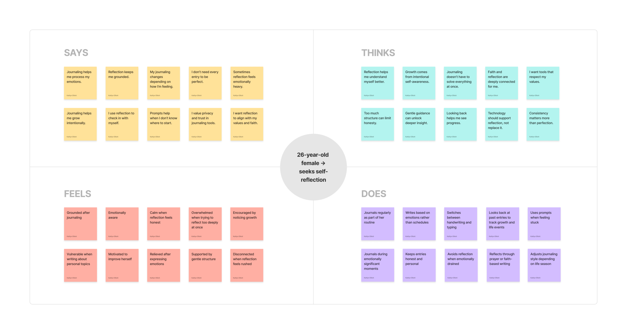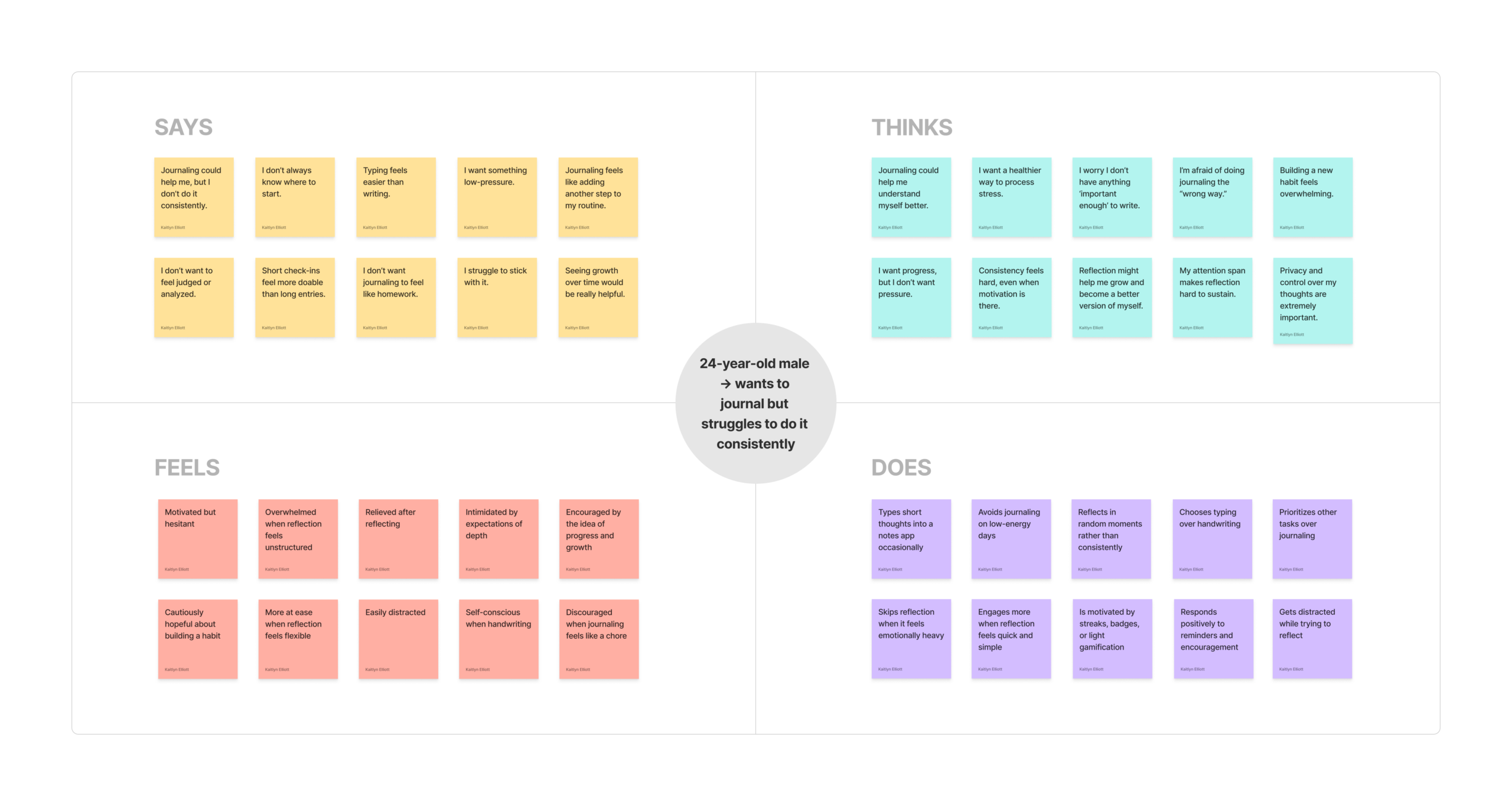 To better understand our personas, we mapped each persona’s current journaling experience before introducing any design solution. Our goal was to identify pain points, emotional patterns, and clear opportunities for improvement.