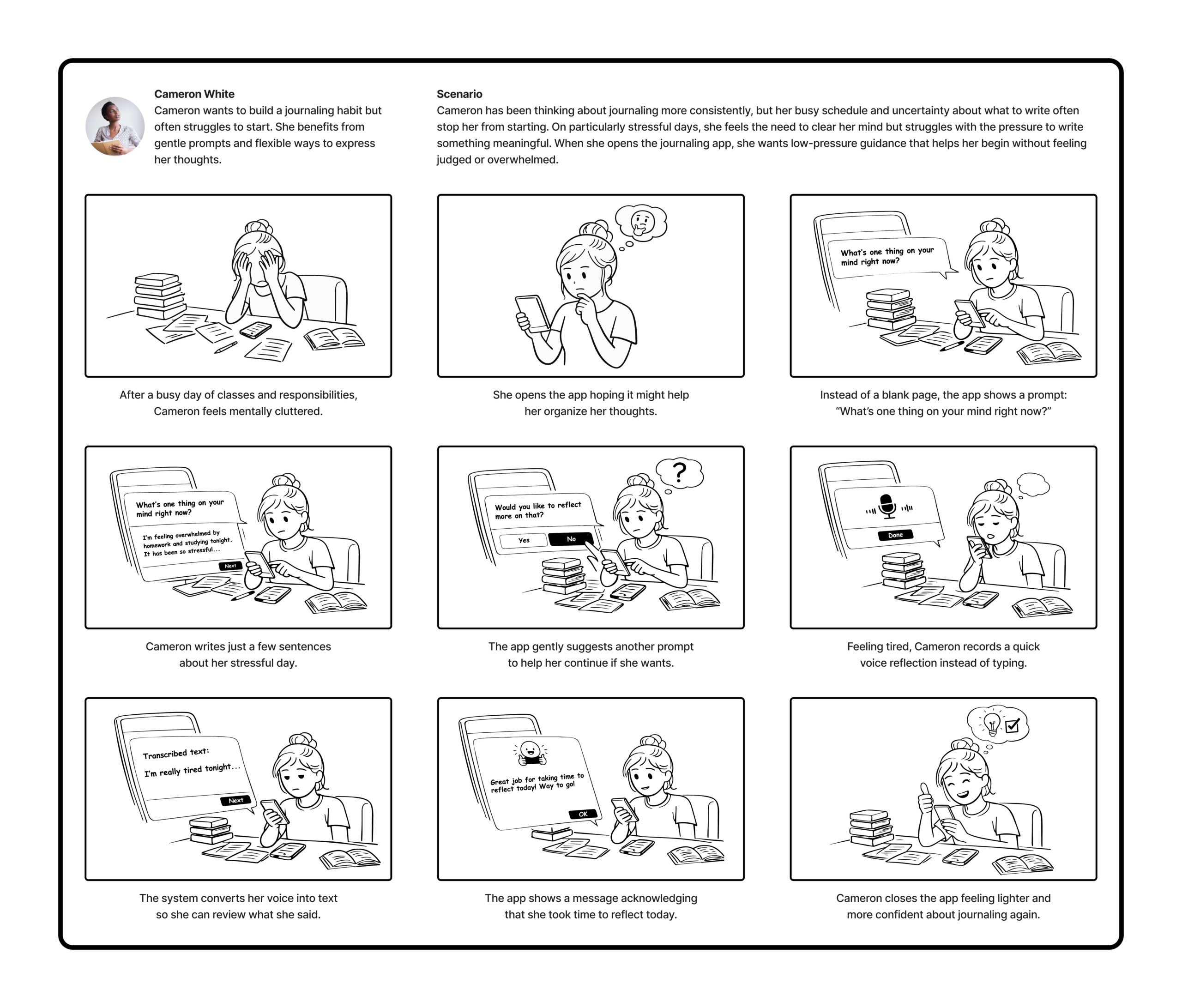 To explore how the system might be used in real life, I created two storyboards based on our personas: Cameron and Lucas. Each storyboard illustrates the context of use, the user’s actions, and how the system responds during the interaction.