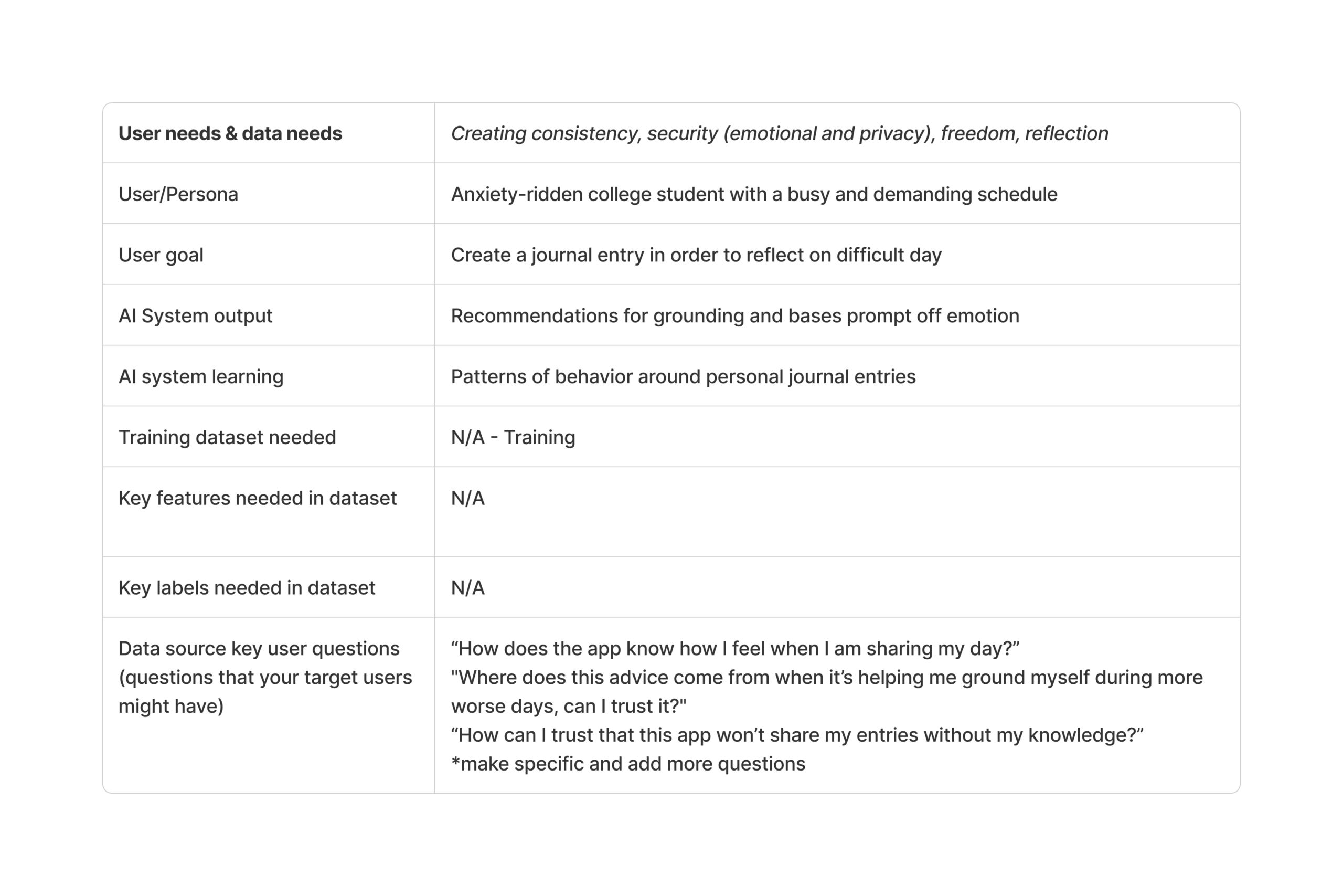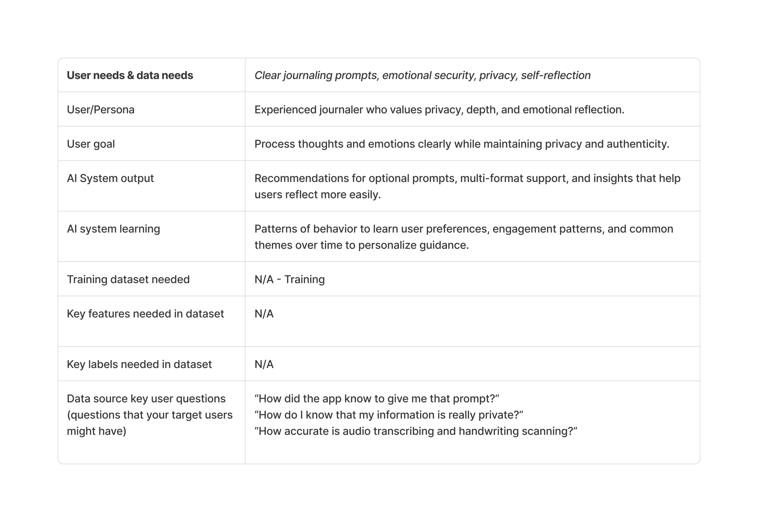 Finally, we mapped user needs to clear data requirements to ensure the solution is grounded in both user insights and responsible data use. We determined that the system needs curated inputs such as user-generated journal entries (typed text, transcribed voice recordings, or digitized handwriting), and user-controlled preference settings. These inputs allow the system to generate contextual prompts, summarize past reflections, and surface growth patterns over time. Importantly, all data originates directly from the user within the app, and no external emotional or diagnostic datasets are required.