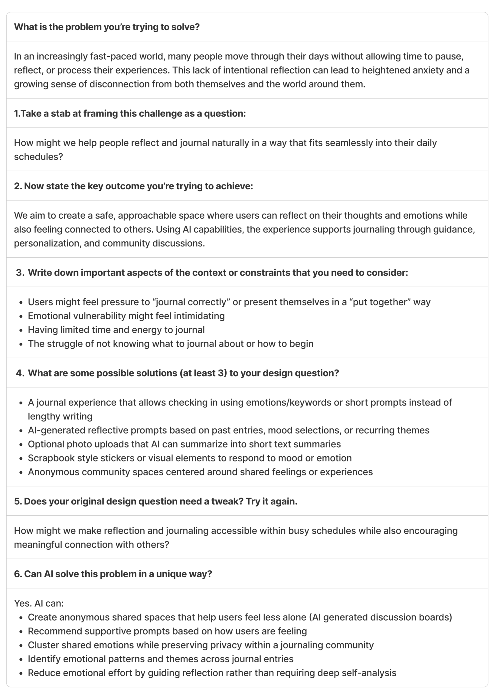 This project focuses on AI-driven design to make journaling easier and more approachable. AI personalizes prompts and summarizes entries to reduce effort while supporting reflection and emotional well-being.