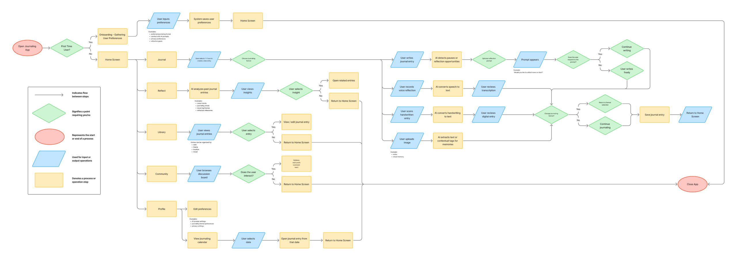To better understand how users would interact with the journaling system, I created a user flow diagram that maps the main paths a user can take while using the app.