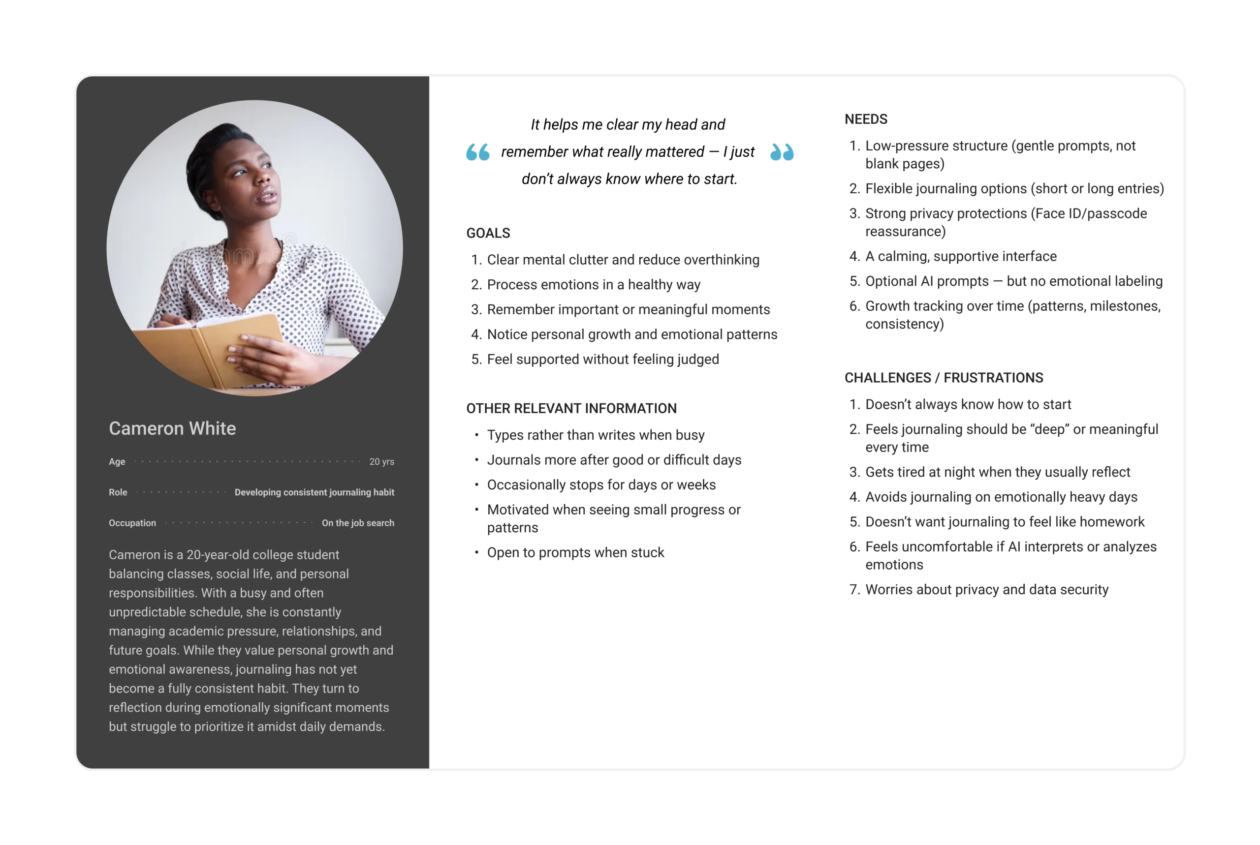 This helped us recognize that the biggest barriers often happen before or during the act of journaling, not after, emphasizing the importance of designing for safety, flexibility, and low-pressure reflection.