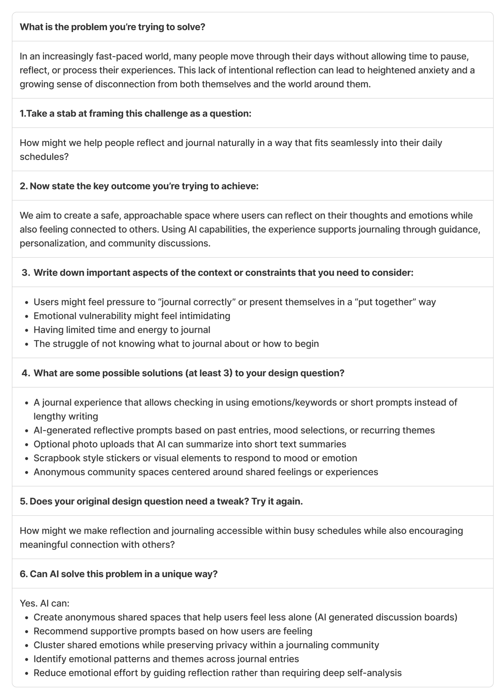 This stage helped me slow down and think more intentionally about the problem before designing solutions. I realized that journaling isn’t a one-size-fits-all activity. Some days people want to write, other days they want to talk, record, or reflect quickly. Conducting secondary research helped me validate these ideas with real data and existing studies, which made my design challenge feel more grounded and meaningful.