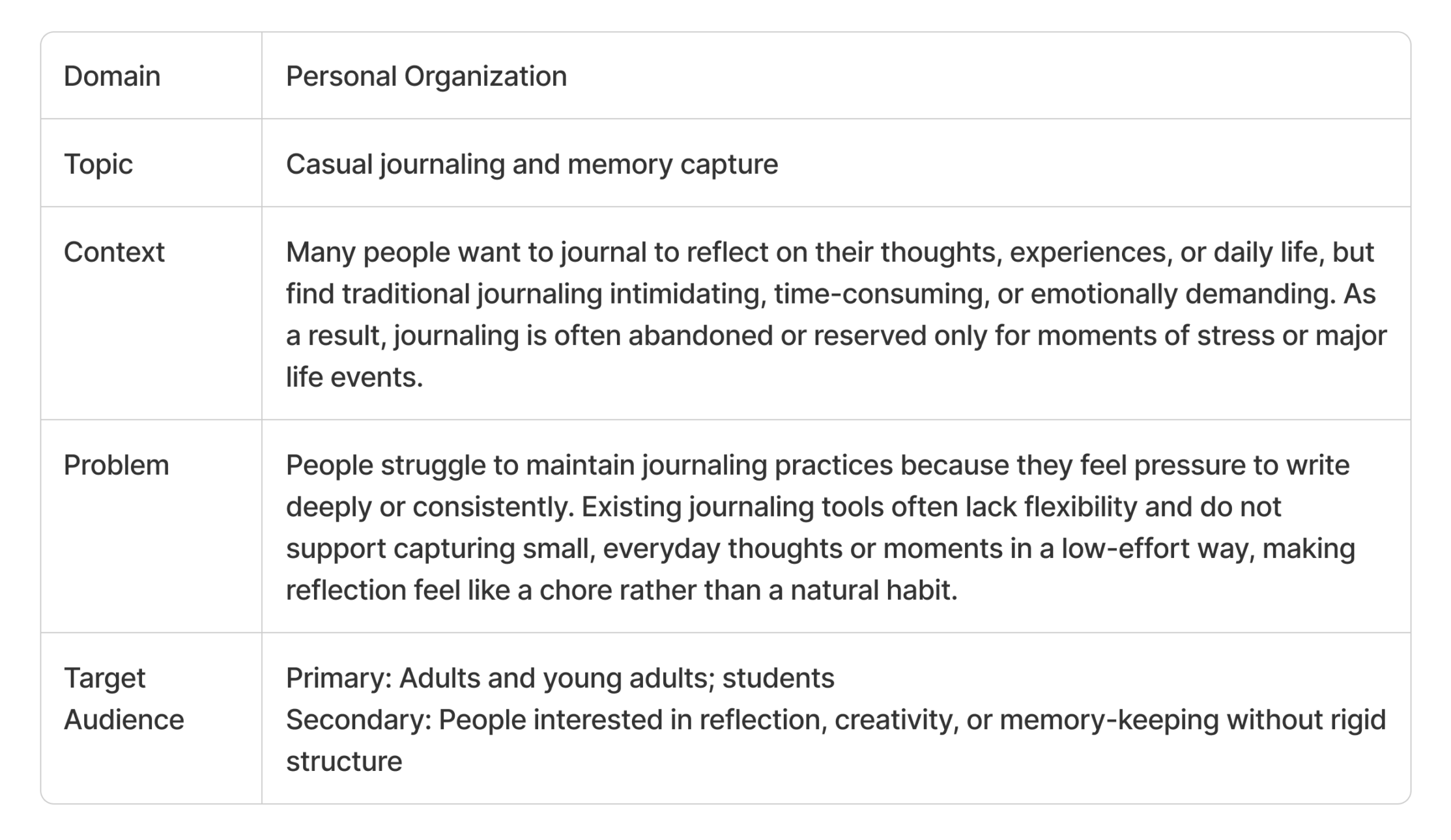 The goal of this stage was to slow down and really understand the problem before jumping into design. I wanted to learn how journaling and reflection have been approached in the past, how current digital tools support it, and where people still struggle. This helped me frame a design challenge based on real research instead of assumptions.