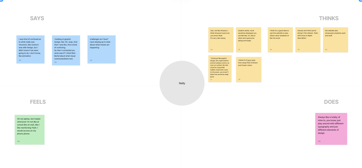We then organized all the gathered information from the participants and input the correlating thoughts, needs and feels of the user into groups. Through these interviews, I’ve learned that people often prioritize simplicity over an intricate design. Many participants have stated their difficulties and frustration with cluttered websites and how they make it difficult to find information.