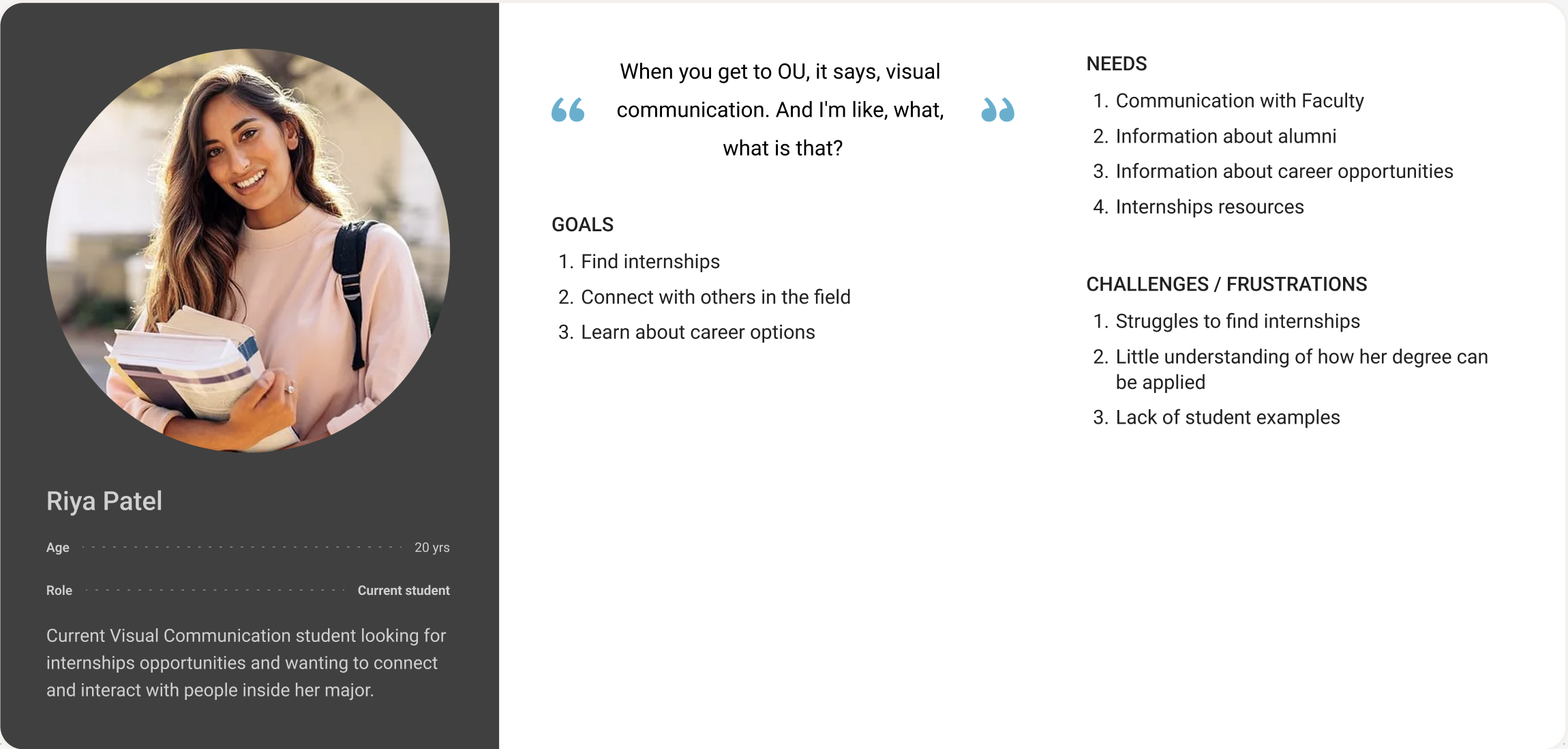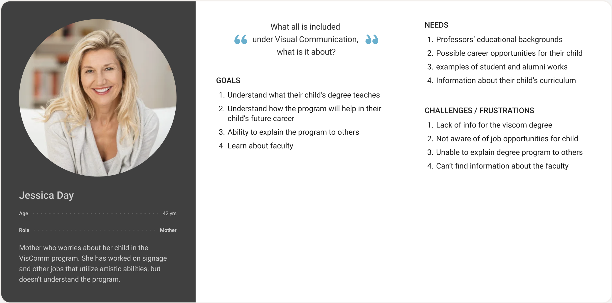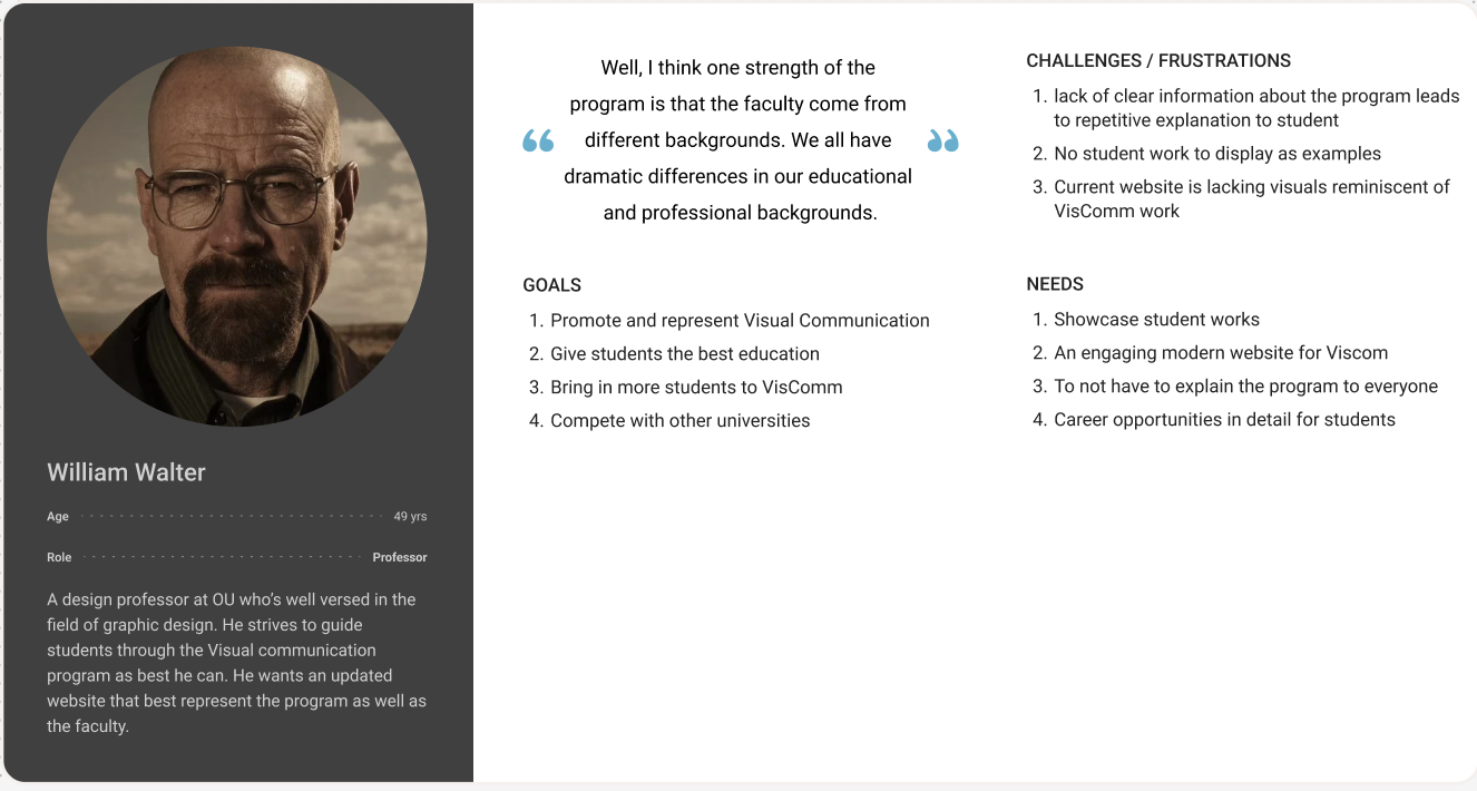 In order to better understand the users needs, we conducted multiple interviews of parents, students and faculty to get an insight on what the program is lacking and what information would be helpful for the Viscomm website.