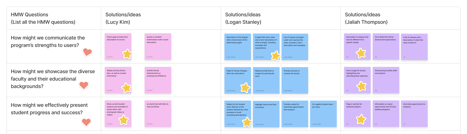 As a team we came up with what we felt to be the most valuable questions based on our interviews, then we all came up with separate ideas and solutions and then continued to group all of our ideas together that were similar. The top 3 questions were what we thought would best fit our users needs. Which is to better understand the program, being able to have information on professors and to view students work and success within the program.