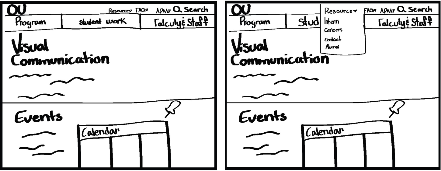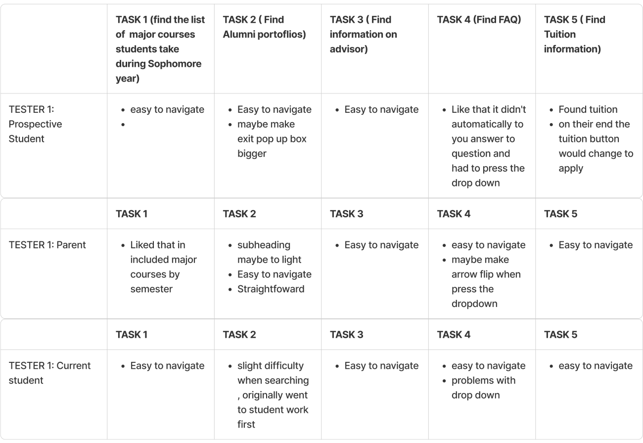 I used th think aloud testing method to evaluate the usability of the wireframes involving 3 participants. Each user had different difficulties when navigating the task. The prospective student had easy navigation for each task and thought it was straightforward. Parent user also thought it was straight forward, thought the subheadings maybe should be a different size to not get mixed of what the primary page was about. Current student user had easy navigation, with all the task except for finding the alumni portfolios. The first action they took when looking for alumni portfolio was too look in students tab under student work, there second action was to look in the students tab under resources. I could probably fix the hesitation with finding alumni information by making it a page in the navigation bar.