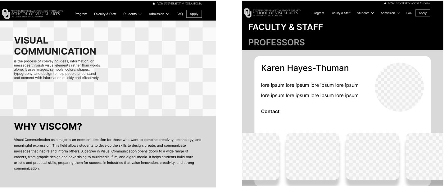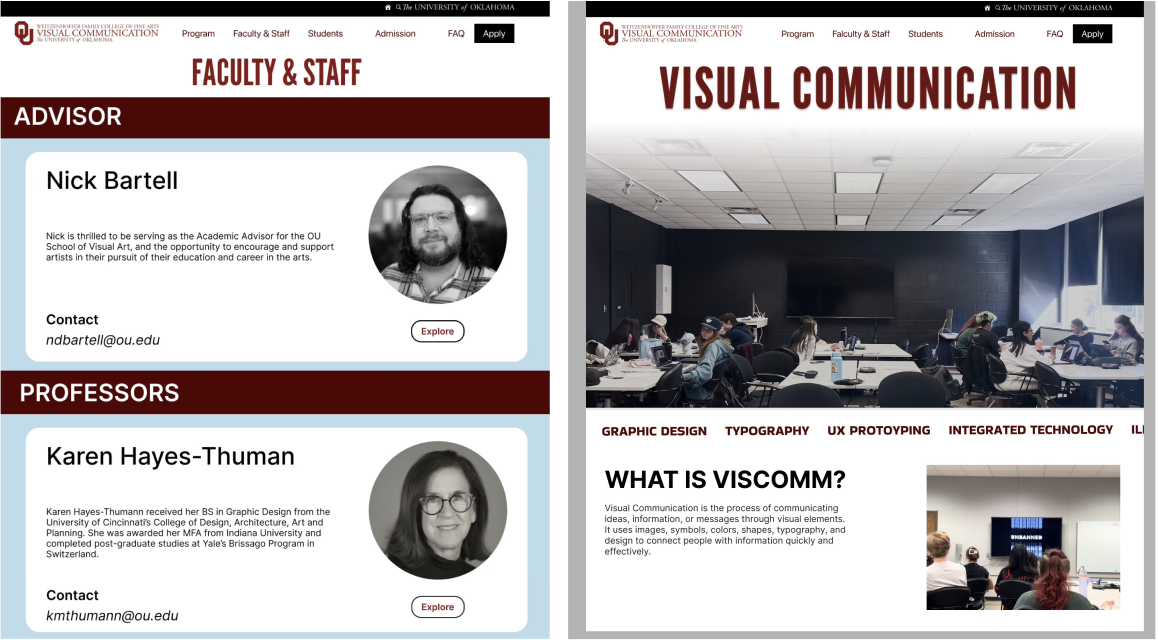 From looking at the competitor websites, it’s clear that the OU website is lacking information on what the Viscomm program is. From examples of the competitor website, clear information and showcasing the students work can give people on insight on what the program includes of.